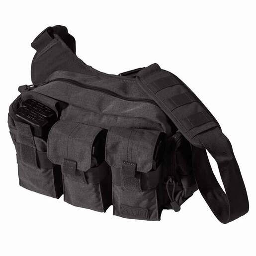 5.11 Tactical Bail Out 9L Range Bag - Black - An always-ready solution for urgent operations, the Bailout Bag has outside pockets made to house 6 standard AR magazines or 3 .308 magazines, plus additional internal and external platforms that are ever needed and will fit in here. Built from rugged, lightweight, all-weather 1050D nylon, and featuring an adjustable quick-release strap, the Bailout Bag will see you through the day's battle. Made for Active Shooter Response Teams Three front pockets hold six AR magazines MOLLE/5.11 SlickStick® web gear expandability 1050D nylon construction Side utility pockets Adjustable strap with quick-release drop Internal hook and loop closure for pull-out pouches Padded aero-mesh at rear to prevent abrasion Shoulder pad is removable for added speed Imported Dimensions: Main Compartment - 8.25” H x 11.75” L x 4.5” D Left and Right Side Pockets - 6.5” x 4.75” x 1.75” Total Capacity - 544 cubic inch / 9 liter total capacity Weight - 1.4 lbs
