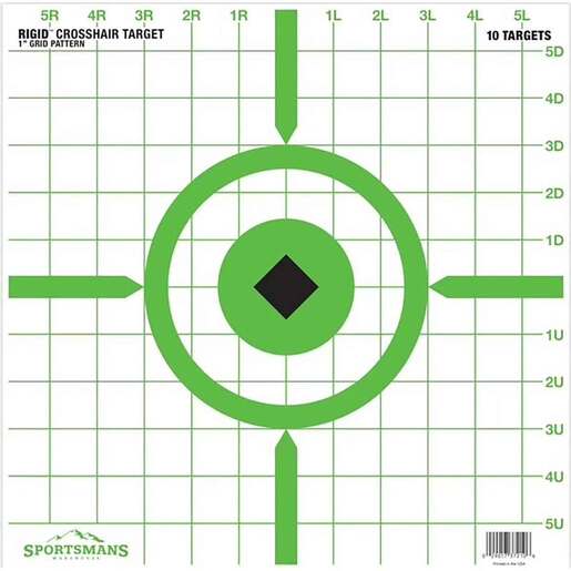 Sportsman's Warehouse Rigid 12in Crosshair Sight-In Paper Targets - 10 Pack - Rigid Paper Targets are made of a stiff tagboard construction. The contrasting red/black on white print is highly visible from both short and long distances. Each target is 12x12, comes in packs of 10 sheet/targets and is printed in the USA. The circle square and crosshair designs are superb for open sights and optics at all distances.