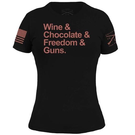 Grunt Style Women's Wine & Chocolate & Freedom & Guns Short-Sleeve Casual Shirt - There is really not much else needed. Get this awesome shirt to show off what matters to you. Ultra-comfortable and soft for all-day wear Tagless, itch-free design Style: GS4916