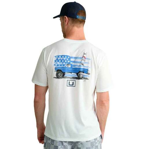 Huk Men's KC Americana Series Short-Sleeve Casual Shirt - The Huk KC Scott Americana Series Tee is the perfect choice for any anglers wardrobe. Crafted with a 50/50 cotton/performance blend Provides all-day comfort and top-notch performance Huk graphic on the back Style: H1000548