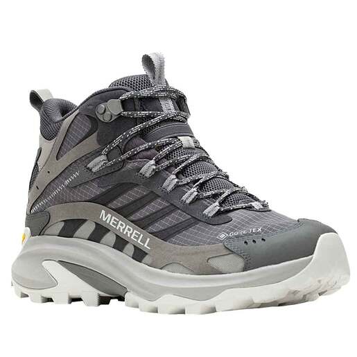 Merrell Men's Moab Speed 2 GORE-TEX Waterproof Mid Hiking Boots - The Moab Speed 2 Mid GORE-TEX is the latest innovation in hiking from Merrell. This new and improved generation of hiking shoes pairs the knowledge and trail insights from the best-selling hiking boot, the Moab, with the latest innovations from athletic hikers across the globe. Padded collar Bellows tongue keeps out debris Protective and abrasion resistant synthetic heel and toe cap Dual heel and tongue loops for ease of entry as well as carabiner compatibility Cleansport NXT treated for natural odor control Lightweight FlexPlate technology provides torsional rigidity, lateral stability, and forefoot flexibility FloatPro Foam midsole for lightweight comfort that lasts Vibram TC5+ outsole provides exceptional traction for outdoor multi-sport activities, formulated exclusively for Merrell Vibram traction lugs specifically designed to increase traction and shed debris with each step Style: J037503Z