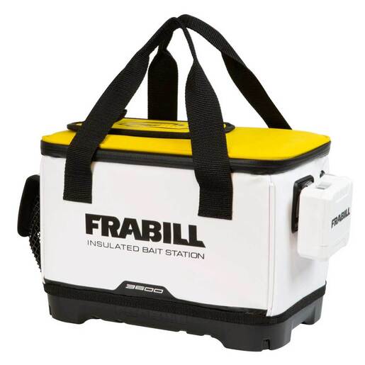 Frabill Universal Bait Station - Finally – a durable yet portable cooler designed specifically for live bait. With a side-mounted aerator and insulated construction, the Universal Bait Station is a re-invented solution to keep bait safe and healthy. The soft-sided cooler easily follows you wherever the fish are biting and stays in place with a nonslip base. The quick-access bait door even allows for efficient capture through the lid. Holding up to 8 quarts of water, ice, soil or tackle boxes, the Universal Bait Station fits all your needs and all your bait. Insulated and waterproof interior keeps bait fresh Battery operated aerator includes hose and stone Durable molded base features non-slip pads Easy access bait door on lid