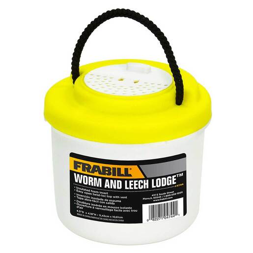 Frabill Worm & Leech Lodge - The Frabill Worm & Leech Lodge is the perfect way to keep your worms, leeches, and other live bait lively. The Lodge features an insulated foam insert and easy-to-open, ventilated lid with secure locking points. The bait bucket's ventilated lid provides additional air circulation to assure your bait remains lively. Features a grab-and-go rope handle Easy-open, ventilated, twist-loc lid Insulating foam liner Comfortable carry handle