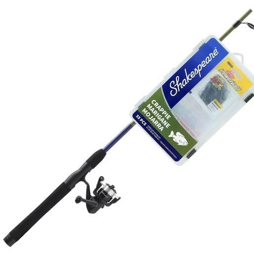 Shakespeare Catch More Fish Crappie Spinning Combo- 7ft, Ultra Lgiht Power, 2pc - With a Shakespeare Catch More Fish combo, anglers will have everything they need to enjoy a day on the water catching crappie. In addition to a Shakespeare rod and reel, the combo includes Berkley branded bait, assorted tackle, and is pre-spooled with 4 LB Stren monofilament fishing line. Contents: 18-Berkley PowerBait Minnows 2-Marabou Jigs 6-Grubs 12-Hooks 4-Jig Heads 10-Split Shots 2-Bobbers 1-Stringer 1-Rigging guide