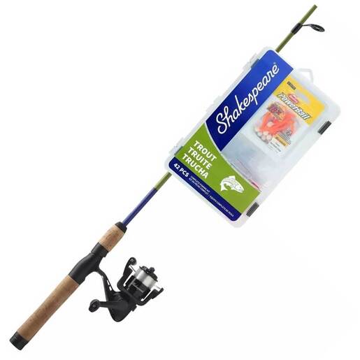 Shakespeare Catch More Fish Trout Spinning Combo - With a Shakespeare Catch More Fish combo, anglers will have everything they need to enjoy a day on the water catching trout. In addition to a Shakespeare rod and reel, the combo includes Berkley branded bait, assorted tackle, and is pre-spooled with 4 LB Stren monofilament fishing line.. Contents: 13 - Berkley PowerBait Floating Mice Tails 2-Inline Spinner Baits 3-Bobbers 4-Swivels 5-Trout Hooks 8-Split Shots 1-Stringer 1-Egg Sinker 5-Treble Hooks 1-Rigging guide