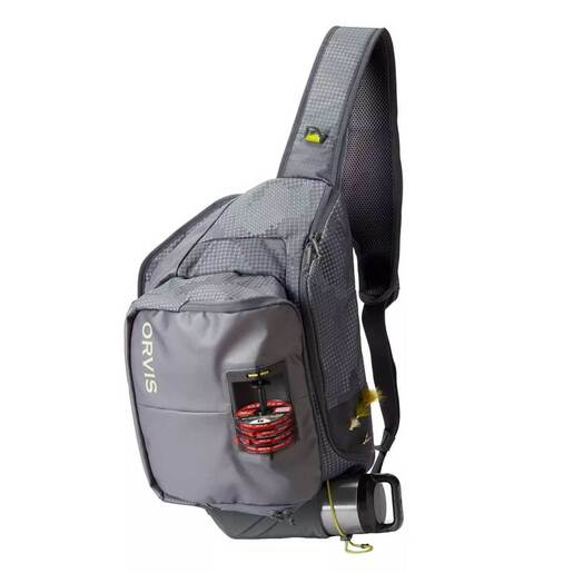 Orvis Angler Guide Tackle Sling - Whether you're a fly-fishing guide or an angler looking for exceptional capacity, durability, and convenience, the Orvis Guide Sling Pack provides a multifunctional, 100% recycled CORDURA re/cor platform designed to store and organize, offering easy, intuitive accessibility. The Guide Sling can carry multiple large fly boxes, packable rain gear, water, and all the tools and accessories needed for a full day or even days on the water. 100% recycled CORDURA re/cor Patented Tippet Whippet recessed docking station with tippet bar included 18 liters of capacity and innovative new features Integrated net storage stows the net handle securely Large main body storage pocket with internal features Smaller main body zippered pocket with internal features Front strap zippered pocket with hide-behind forceps stash, zinger docking station, fly patch, and rear D-ring Zinger/nipper pass-through Water bottle pocket with retainer Ridged back panel for increased structural integrity and air flow Left shoulder design frees up casting arm and shoulder