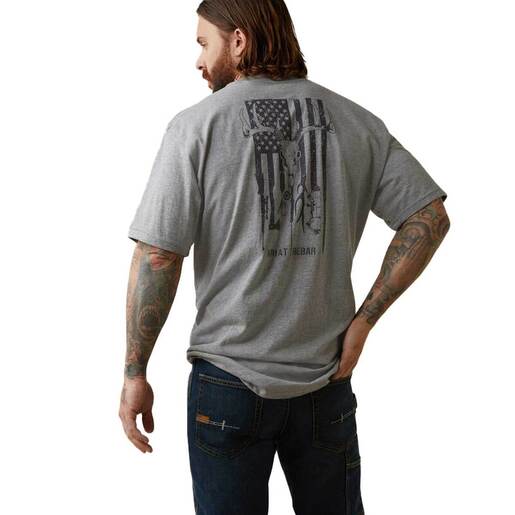 Ariat Men's Rebar Cotton Strong American Outdoors Short-Sleeve Casual Shirt - Rebar Cotton Strong shirts feature ultra-comfortable yet equally durable cotton jersey that is pre-shrunk to prevent shrinkage. This style is topped off with an eye-catching graphic that honors the great American outdoors. Perfect for everyday wear with a familiar, easy fit Greater Arm Mobility lets you move freely Long back hem helps keep you covered while you bend and stretch Ribbed collar Chest pocket with hidden pen/pencil slot Style: 10043828