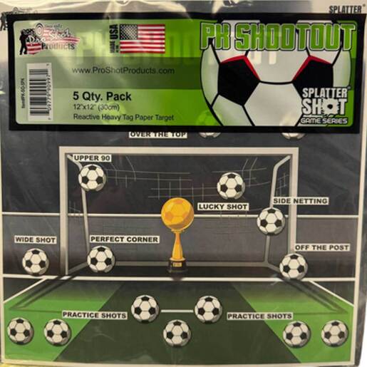 Pro-Shot Game Series 12in x 12in PK Shootout Soccer Heavy Tag Paper Target - 5 Pack - Try for the goal while practicing your aim with this shooting target game. Features Bullet holes are revealed with bright white rings Heavy tag paper target (non-adhesive) Instant feedback – no need to walk downrange or use binoculars to see your shot Packaged in zip top bag Made in USA