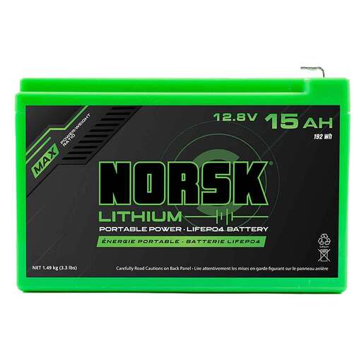 Norsk Lithium MAX Green Series Battery W/3A Charger - The 12.8V lithium battery by Norsk Lithium is engineered to deliver superior power in a lightweight, compact design, offering the highest power-to-weight ratio in its class. Built as a direct replacement for standard SLA batteries, this LiFePO4 option is ideal for those who prioritize performance without adding features like USB ports or a battery meter. Its IP67 rating makes it the first waterproof portable sonar battery of its kind, ensuring it is both dust-tight and fully protected against water immersion for extended periods, making it perfect for rugged environments and outdoor applications. One of the standout features of this battery is its advanced Battery Management System (BMS). The BMS actively monitors and protects the battery from common issues such as overcharging, over-discharging, overheating, and short circuits, ensuring maximum safety and optimal performance. With over 2000+ life cycles, this battery ensures long-lasting, dependable performance, significantly reducing the need for frequent replacements. Whether you’re powering fish finders, GPS systems, or other critical devices, the 12.8V LiFePO4 Battery offers the reliability and durability you can count on. The advanced lithium iron phosphate chemistry provides enhanced safety, a longer lifespan, and superior energy density compared to traditional lead-acid batteries, all while being much lighter, which improves overall mobility for portable use. This versatile battery is perfect for marine applications, camping, or any power-hungry task where size, weight, and longevity are crucial. Whether exploring the open waters or enjoying a day in the wilderness, this battery delivers consistent power performance you can trust. Includes 3A 14.2V standard charger Max power-to-weight ratio in standard SLA size IP67 Waterproof Rated IP67 Waterproof ensures that your Norsk Lithium Marine Battery is fully protected against dust and capable of withstanding immersion in water up to 1 meter deep for 30 minutes. This high level of protection guarantees that your battery remains operational in the harshest marine environments, providing reliable performance and durability. NOTE: Does NOT include USB ports, battery meter, and Bluetooth.