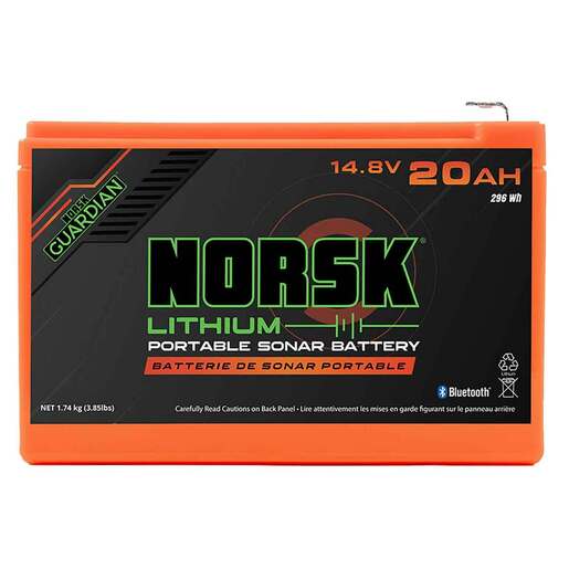 Norsk Lithium Guardian Orange Series Battery with Charger - The Guardian Orange Series battery is designed for live imaging or forward-facing sonar systems. This is the perfect lithium battery for Humminbird MEGA Live Imaging, Garmin Livescope and Lowrance ActiveTarget. Batteries now feature Dual IPX8- rated waterproof USB-A & USB-C Ports and an upgraded battery meter to check the state of charge. The battery’s Deep Sleep functionality disconnects power from the terminals, eliminating self-discharge. With Bluetooth capability, you can easily monitor the battery’s status and performance from your smartphone via the Norsk Guardian App. This is the perfect lithium battery for Humminbird MEGA Live Imaging, Garmin Livescope and Lowrance ActiveTarget. Its high capacity and reliable performance ensure that your sonar systems operate seamlessly during your time on the water. Comes with a standard 3A charger. Includes 3A 16.8V standard charger Deep Sleep (eliminate phantom draw) Bluetooth compatible with the Norsk Guardian app for iOS & Android Dual IPX8-rated waterproof USB-A & USB-C Ports Built-in battery meter Power Management Button Norsk Advantage 4 Year Standard Warranty with up-to 6 Year with Guardian App Sign up IP67 Waterproof IP67 Waterproof ensures that your Norsk Lithium Marine Battery is fully protected against dust and capable of withstanding immersion in water up to 1 meter deep for 30 minutes. This high level of protection guarantees that your battery remains operational in the harshest marine environments, providing reliable performance and durability. DEEP SLEEP Disconnect power from your battery’s terminals using this feature in the Norsk Guardian app to eliminate fully-discharged batteries caused by phantom draw – storing your battery has never been easier! ONE-TOUCH POWER MANAGEMENT The Power Management button allows the user to quickly check State of Charge, and manage advanced features such as Deep Sleep or BMS (Battery Management System) reset. NORSK GUARDIAN APP INTEGRATION Seamlessly manage your battery’s performance with the Norsk Guardian App. Monitor battery status and control the Deep Sleep mode all from the convenience of your smartphone. THE NORSK ADVANTAGE Our batteries stem from the dedication of outdoor enthusiasts relentlessly pursuing advanced rechargeable lithium technology to power their passions. Recognizing the urgency of a robust power source, the Norsk 14.8V 20Ah Lithium-Ion Battery is designed to endure over 2,000 charge cycles, backed by an exceptional warranty. Enjoy a standard 4-year warranty, plus an additional 2 years when you sign up for the Norsk Guardian App, ensuring enduring performance. Whether you’re braving the cold on a fishing trip or embarking on an off-grid adventure, Trust Norsk Lithium to deliver reliable power when you need it most.