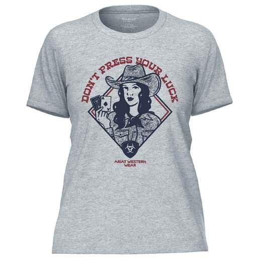 Ariat Women's Don't Press Your Luck Short-Sleeve Casual Shirt - Show 'em who holds all the aces in this comfy graphic tee. Crafted from soft, 100% cotton, it's an everyday staple that'll stand out in the barn and beyond. Straight, loose fit with extra length in the sleeves and body Screen printed graphic 100% Cotton Style: 10062349