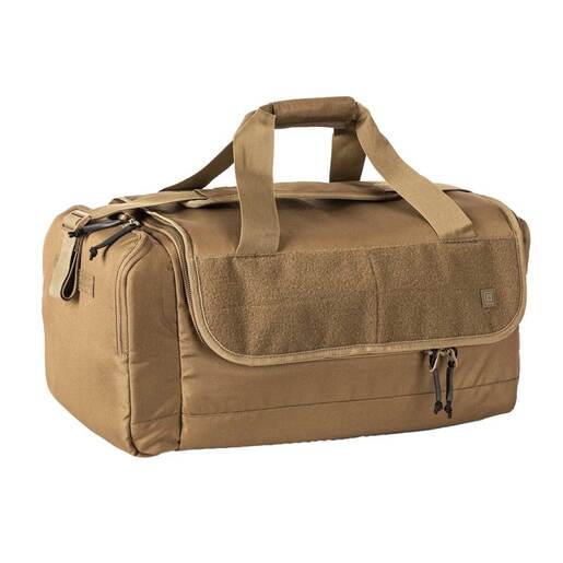 5.11 Tactical Range Ready Trainer Bag - Kangaroo - The Range Ready Trainer Bag has space to hold everything you need for a day at the range. Fully padded with a PE board base to keep your gear safe while the removable dividers let you customize the bag. Internal quick access elastic mag and accessory panel as well as elastic loops under the lid give you the ability to carry loaded anywhere you go and that's just the main compartment. Three side compartments and MOLLE webbing let you take even more. Imported. FEATURES: Large loop front panel for patches/ID Fully padded construction with PE board base Left side pull down pouch with internal org, name tape Right side external web MOLLE Dual rear zippered pouches Top carry handle, removable shoulder strap Quick access front internal elastic mag/accessory panel Internal removable dividers and elastic bands Underside lid elastic bands YKK lockable zippers 600D Polyester DIMENSIONS: Measurements: 10in H x 21in L x 14.5in D Total Capacity: 3051ci Volume: 50 L Weight: 4.3lbs