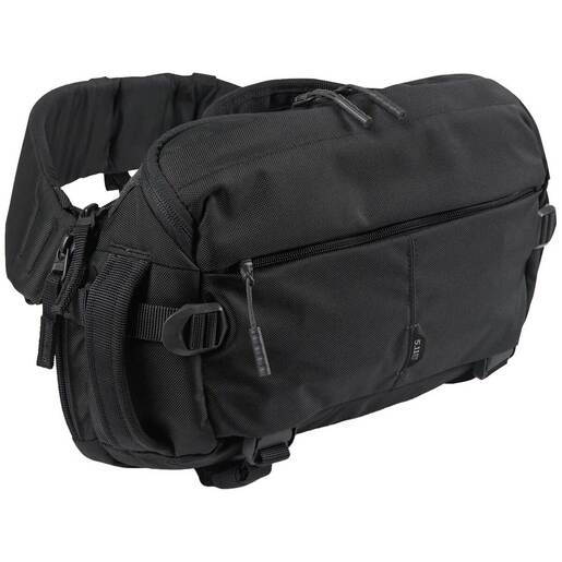 5.11 Tactical LVC8 Sling Pack - Black - If grab-and-go is the job description or lifestyle, the 5.11 Tactical LVC8 Sling Pack is ready to move when the call comes in. Its 8-liter volume packs all the right features with an internal admin organizer, laser-cut MOLLE straps, and storage pockets to keep things organized. The CCW compartment includes a full loop panel and removable holster strap. The LVC8's exterior includes a lined zippered pocket, fleece-lined smartphone/device pocket, and the 840D nylon construction will survive years of high-speed torture. A padded back panel, quick-release shoulder strap, and removable sternum strap ensure all-day comfort. FEATURES: 5.11's signature Center Line design Ambidextrous shoulder strap for sling carry with quick release buckle, removable sternum strap and CAM buckle Internal admin org and pockets; Padded sleeve with strap closure; Loop face laser-cut MOLLE CCW compartment with full loop panel, and removable holster strap, hot pulls - fits Glock 17 Padded back panel; flex cuff channel External nylon lined zippered pocket External fleece lined device/media pocket Bottom webbing straps Tuckable logos for low vis 1 Top and 2 side grab handles 840D Nylon Dimensions: 4in L x 14in W x 8.5in H Weight: 2.6lbs Capacity: 488 Cubic in / 8 Liter Total Capacity