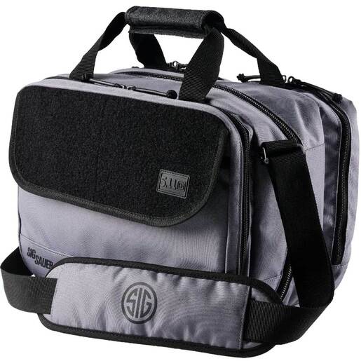 5.11 Tactical SIG Sauer X 19L Range Ready Pro Bag - Medium Grey - Keeping organized is easy with the multi-pocket Range Ready Qualifier bag. This tough, padded bag measures 13" L x 9" W x 8.75" H and comes equipped with lockable YKK zippers in an exclusive SIG Sauer colorway. The Qualifier is constructed from durable, all-weather 600D polyester with a TPU bottom to protect your gear. A zippered clamshell front pocket includes a document slip pocket, elastic band loops and a wipe-clean disassembly panel. In the main pocket, we added two padded, zippered pistol storage pockets, plus a removable divider with elastic bands and a web MOLLE panel. Dual rear zippered pockets with MOLLE facing hold extras. A top grab handle and removable padded shoulder strap make the Range Ready Qualifier an ideal grab-and-go solution for pistol training and qualifications. Exclusive SIG Sauer colorway Fully padded construction Front large slip pocket with hook/loop closure Full clamshell front zippered pocket with internal zippered pocket, elastic bands, and wipe clean disassembly panel Full clamshell main compartment with two padded zippered compartments for pistol storage Removable divider with elastic bands and web MOLLE panel Dual padded rear zippered pockets External MOLLE panels / Embroidery friendly Top grab handle and removable padded shoulder strap Lockable YKK zippers Textured P600D TPU coated base 600D polyester with PU coating and DWR finish