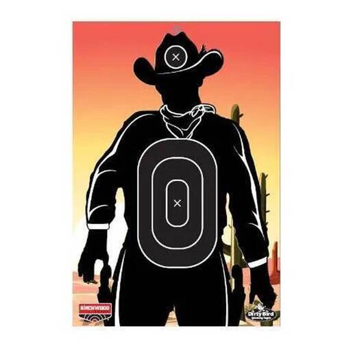 Birchwood Casey Dirty Bird Gunslinger Skyline Target - 6 Pack - features a bold cowboy silhouette with distinct white targets on the torso and head for precise shot placement. Designed for accuracy training, this target helps shooters focus on vital areas while adding a western-themed flair to their practice sessions. Features: 12inx18in 6-pack