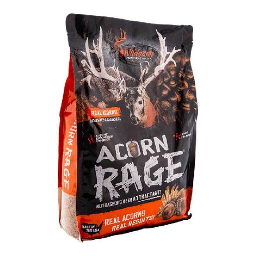 Wildgame Innovations Acorn Rage - 5lbs - Wildgame Innovations’ Acorn Rage is still one of the most popular hunting attractants out there ” because it works. Deer have been known to abandon corn, wheat and even lush foot plots in search of acorns. Acorn Rage feeds their obsession with 100% real crushed acorns blended with roasted soybean to create a long-lasting hunting attractant that’s as nutritious as it is palatable. When you spread Acorn Rage at a ground site or top it on a feeder, a natural acorn scent erupts that sends deer’s senses into a frenzy. Airborne Technology disperses 600% more scent molecules than ordinary feed grains to cover long distances with incredible speed. Once deer find the source of that scent, they’ll devour it, along with vital nutrients they need to support antler growth and overall health. Acorn Rage feed comes ready to use straight out of the bag and effectively attracts deer year-round.
