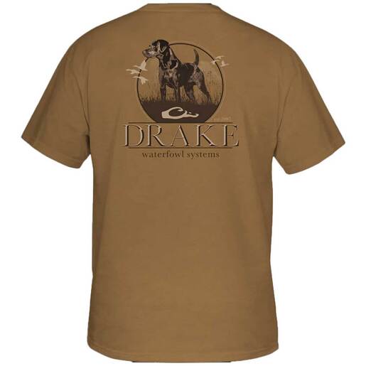Drake Men's Standing Black Lab Short-Sleeve Casual Shirt - The Drake Waterfowl Graphic Tee is constructed with a 60% cotton and 40% polyester blend which supplies softness and comfort. The Drake Waterfowl Graphic Tee has a Drake logo on the front pocket and depicts a standing Lab from our Dogs of Drake Series of back graphic tees. Drake Logo Pocket on the Front 60% Cotton/40% Polyester Lightweight at 180 GSM Style: DT9654