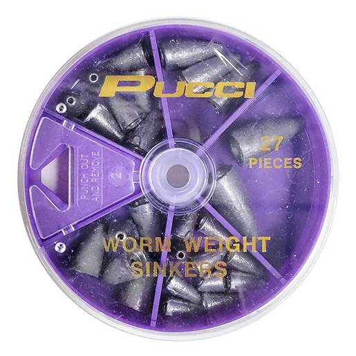 G Pucci Worm Weight Sinker Assortment - 27pc - Pucci Worm Weight Sinkers feature high quality metal with a tapered shape designed to easily move through weeds and thick cover. Storage container provides easy access to a variety of weights, with mess-free storage and size selection.