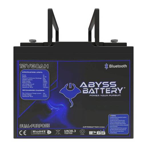 Abyss Dual Purpose Lithium Marine Battery withBluethooth - With the ABYSS® 12V 60Ah Dual Purpose Lithium Marine Battery, not only can you crank and cruise for long, but do so without having to shut off all your electronics. With a peak CCA of 1500A, this multi-purpose marine lithium battery delivers plenty of power when you need to start motors, generators, and other high-load devices. This deep-cycle battery can also be used in a parallel sequence to ensure long and steady power draw to power fish finders, GPS systems, audio systems, chill plates, and Seakeepers. This Group 24 battery is compact, light, and compatible with a wide range of trolling boats, watercraft, RVs, trucks, and automobiles, The ABYSS® 12V 60Ah is a powerhouse that you can depend on each and every outing. Higher qualified Grade-A cylindrical cells - UL1642, IEC62619, IEC62133 listed with Cycle life more than 3000 times and excellent consistency. Bluetooth Connectivity - Monitor the battery status (charge, discharge, current, temperature, cycle life and so on) and change the data for different applications. Push Button Wake-Up/Reset Feature - Located Conveniently on top of the battery case, this button allows for easy waking up or resetting of the battery, ensuring quick and effortless operation. Built-in Heating -Uniform internal heating is an important feature of the cold-weather performance batteries. More stable and firm internal structure. The cell holders within the battery protect and separate each cell to avoid any short circuit risks caused by intense vibration or impact. Dimensions: 10.2in x 6.69in x 8.18in