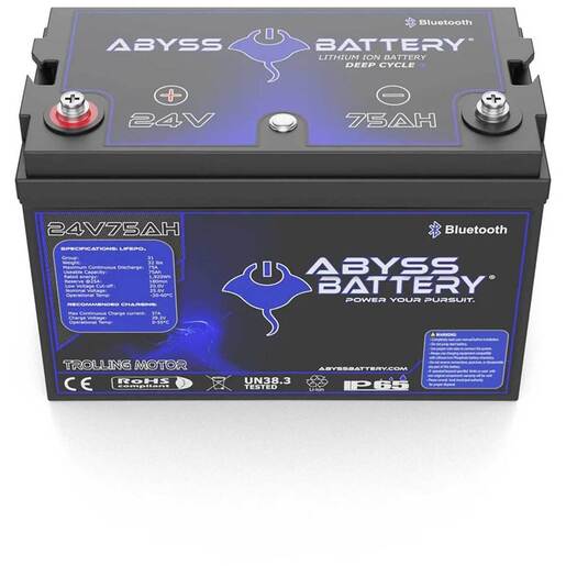 Abyss Lithium Trolling Motor Battery withBluethooth - This single group 31 battery is compact, lightweight, and frees up storage space by replacing two 12-Volt Lead-Acid or AGM group 31 batteries in series. Whether you’re trolling in calm weather or fighting the wind, this battery will back you up even with load-heavy consumption. Ideal for deep cycle applications in diverse marine environments, seasons, and temperatures, The 24V 75Ah gives you a long and steady draw to last even for multi-day fishing trips. Just set it, charge it, and off you go. Higher qualified Grade-A cylindrical cells UL1642, IEC62619, IEC62133 listed with Cycle life more than 3000 times and excellent consistency. Bluetooth Connectivity Monitor the battery status (charge, discharge, current, temperature, cycle life and so on) and change the data for different applications. Push Button Wake-Up/Reset Feature Located Conveniently on top of the battery case, this button allows for easy waking up or resetting of the battery, ensuring quick and effortless operation. Built-in Heating Uniform internal heating is an important feature of our cold-weather performance batteries, as many external heating blanket options currently available cannot sense the internal temperature of the cells and may not be completely effective at heating the battery throughout. Our system features proprietary technology that draws power from the charger itself, requiring no additional components. The entire process of heating and charging is completely seamless. Simply plug the battery into our lithium charger and the internal heating and monitoring system takes care of the rest. More stable and firm internal structure The cell holders within our battery protect and separate each cell to avoid any short circuit risks caused by intense vibration or impact. The separation and space created between each cell also improves the overall heat dissipation within the battery pack while charging and discharging.
