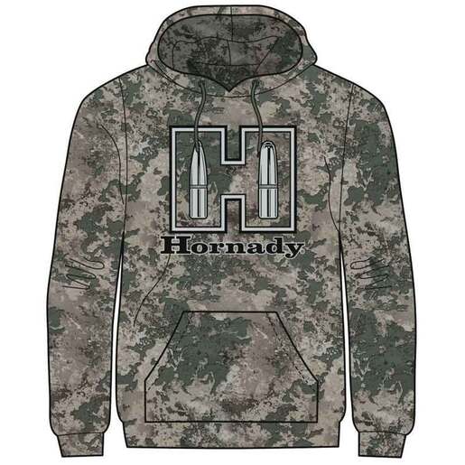 Hornady Men's Camo Fleece Hunting Hoodie - Made for the hunter who wants to look his best when he is not in a blind or tree stand. Drawstring hood Kangaroo pocket Hornady graphic print on front 60/40 cotton/polyester 230g double lined hood Style: 99596