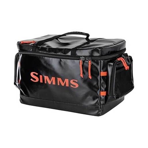 Simms Stash Bag- Black/Orange, 35 Liter Capacity - Simms Stash Bag comes with a lot of great storage options to keep your gear near at hand. Structured storage solution for your on-deck fishing and boating needs. External organization includes zippered pockets for spools and accessories and a stretch mesh stash pocket. Plenty of lash points and webbing loops for attaching tools. Structured seams and a reinforced base ensure your contents are safe. Rugged 1200-denier polyester ripstop material with TPU coating is water-resistant and durable. The top zipper accesses the main compartment with a large zippered mesh pocket under the lid. Spacious main compartment with adjustable internal divider holds up to 5 Plano 3700 boxes vertically oriented. The external organization features zippered spool and accessory pockets on either side with an additional stretch mesh stash pocket and laser-cut lash ports and webbing loops offer attachment of tools, as well as other Simms packs and accessories Padded and removable shoulder strap and a burly rubber handle allow for multiple carrying options.