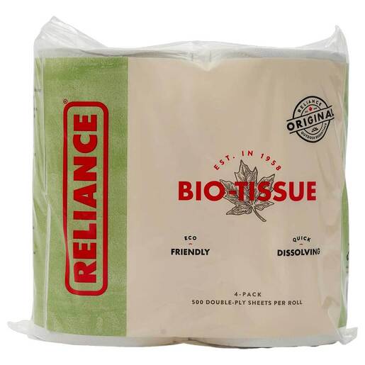 Reliance Bio-Tissue Toilet Paper - We’re an evolved species, which means we no longer wipe with leaves! Bio-Tissue double-ply toilet paper resolved that problem! Our toilet tissue works like regular bathroom tissue except it dissolves quickly and is safe for all RV's and septic tank systems. Made with 100% recycled content & 90% post-consumer fiber, it’s natural, unbleached and chlorine-free. The right choice for you and for the environment. Features 500 - Double-ply sheets/roll 4 rolls/package A better choice for the environment Great value for you Dimensions Length (inches): 10 / Width: 8.5 / Height: 4.5 Weight: 1.34 lbs.