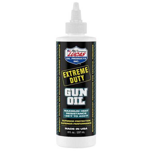 Lucas Oil Extreme Duty Gun Lubrication - 8oz - Lucas Extreme Duty Gun Oil offers superior burn-off resistance. Its polymeric film protects metal from rust, moisture and dramatically reduces wear during all shooting conditions. Applying Lucas Extreme Duty Gun Oil to bores, bolt carriers and gas pistons makes clean-up of powder residue, copper and carbon fouling a much easier task. Apply a light coat to make cleaning quicker and easier. It neutralizes acids from fingerprints and resists drying for long term storage use. Lucas Extreme Duty Gun Oil is great for lubrication on all high heat high use firearms and NFA items. Protects metal parts from rust wear and moisture during extreme conditions Provides maximum heat resistance for reliable performance Superior blowback resistance keeps oil out of your face and off your glasses Ideal for lubrication on all high heat high use firearms and NFA items Neutralizes acids from fingerprints and resists drying for long-term storage use