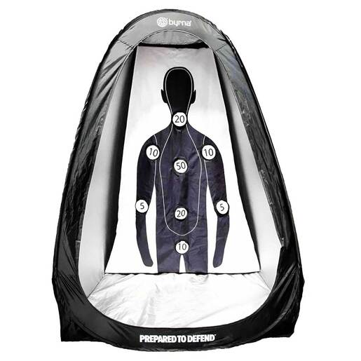 Byrna Full-Size Target Tent Features Reinforced Strength: High quality rubberized nylon with durable steel frame. Featuring a built-in double net to reduce both noise and add additional stopping power. Pop-Open Design: Open and close within seconds. The Byrna Life-Size target tent comes with a compact travel pouch for easy transport. Gamify Your Practice: Tent design allows shooter to easily trap and collect projectiles. Each tent pocket is assigned a point value allowing user to practice and measure progress over time. Tent Size: 66in x 42in x 42in when fully opened. 12in Diameter when closed.