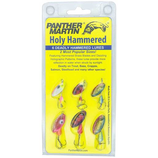 Panther Martin Holy Hammered Inline Spinner - This 6-pack not only offers you some true great new holographic color patterns, it offers the angler true savings on the cost of the individual lures. 3 size 2 (1/16 oz) 3 size 4 (1/8 oz)
