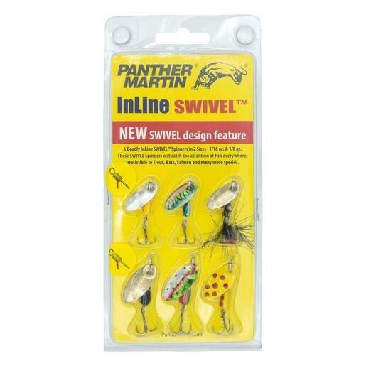 Panther Martin InLine Swivel Inline Spinner - Easier to use and they really catch fish! The Panther Martin InLine Swivel lures provide an easier and better way to use Panther Martins with a swivel. Instead of attaching a double eyelet swivel to an existing eyelet, these lures have the swivel mounted directly in a straight line on the Panther Martin spinner shaft. That keeps the great profile and spinning action. 6 different colors in 2 sizes.