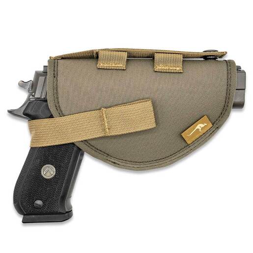 Marsupial Bottom Mount Handgun Holster - Your firearm stays readily available and secure in a structured/padded holster. Adjustable in size, the holster fits a wide variety of handguns and revolvers. Soft loop velcro material lines the holster's inside, allowing the retention strap to be adjusted for tightness. A ring snap secures the strap and can be released with a quick pull on the release loop. Attaches to the bottom Molle Webbing on Marsupial Gear Chest Packs. Does not interfere with side pouch attachments. Features: Rigid plastic for durability Slightly padded interior with soft loop liner fabric Adjustable in size for most larger handguns 1" structured webbing to attach to bottom of Binocular Pack Small: 6.75" overall length. Large: 7.75" overall length Fits most handguns 2.7 oz / 3.2 oz