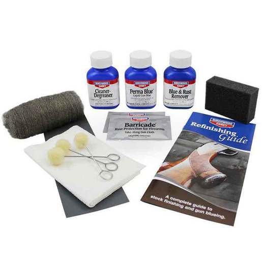 Birchwood Casey Complete Perma Blue Kit- Easy to use, all-inclusive kits are the proven way to touch up or completely reblue most guns. Everything you need for a professional-looking, first-class job is included. Choose from the fast-acting Liquid Gun Blue Kit and the deep, dense Paste Gun Blue Kit. Liquid Kit includes: 3 oz Perma Blue Liquid Gun Blue Bluing Applicators, Sponge, Service Cloth3 oz Cleaner-Degreaser Barricade® Rust Protection Gun Wipes3 oz Blue and Rust Remover Complete Instruction Guide00 Steel Wool Pads