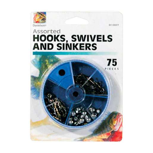 Danielson Hook, Swivel and Sinker Assortment - Complete your tackle box with this 75 piece assortment. It contains baitholder and Aberdeen hooks, brass snap swivels, removable split-shot, and bass casting sinkers in a variety of sizes to cover all bases. 75 piece assortment
