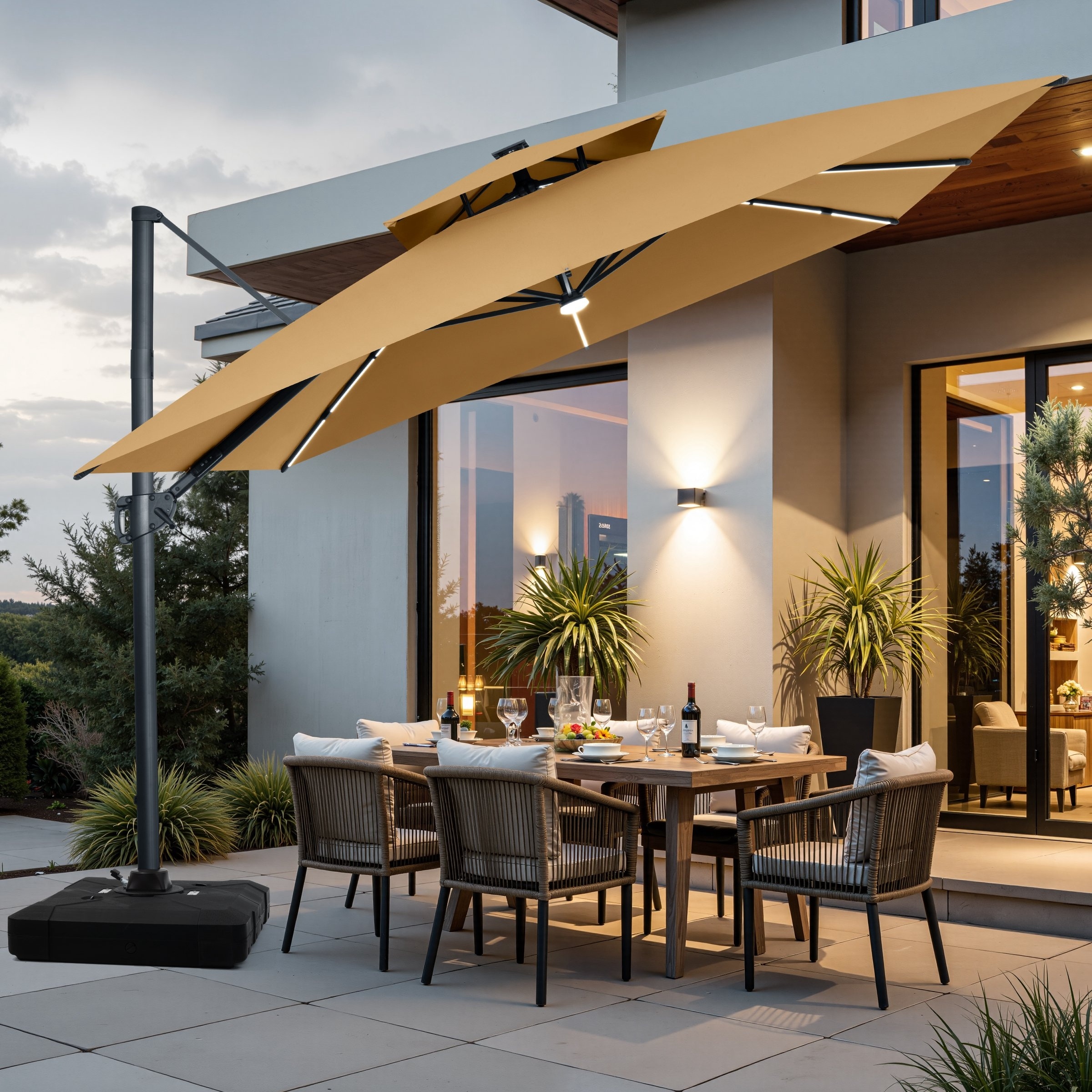 11 FT x 11 FT Solar Powered LED Lighting Aluminum Square Patio Cantilever Umbrella with Weights Base($644.49Value)