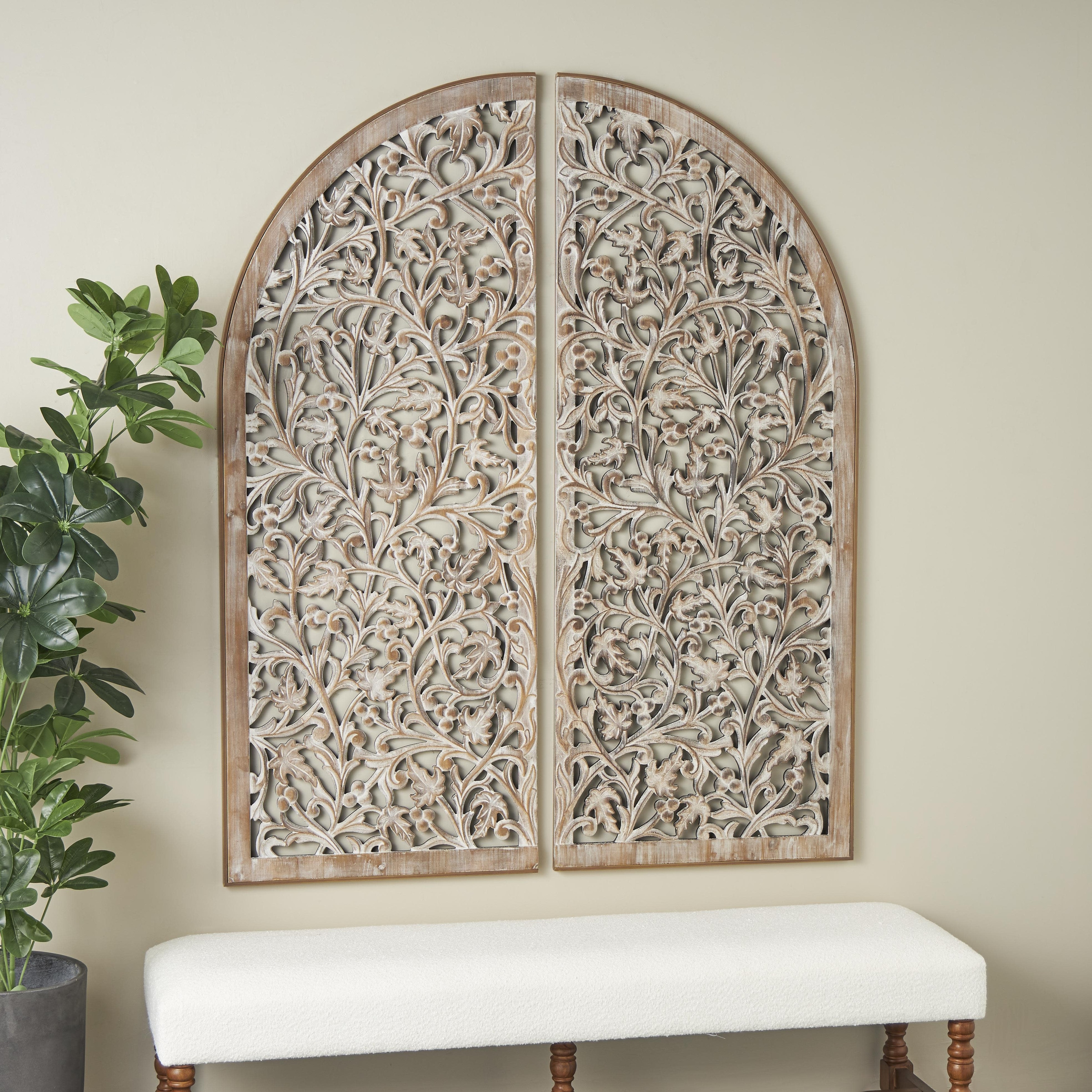 Brown Wooden Handmade Arched Floral Home Wall Decor with Intricate Carvings (Set of 2)