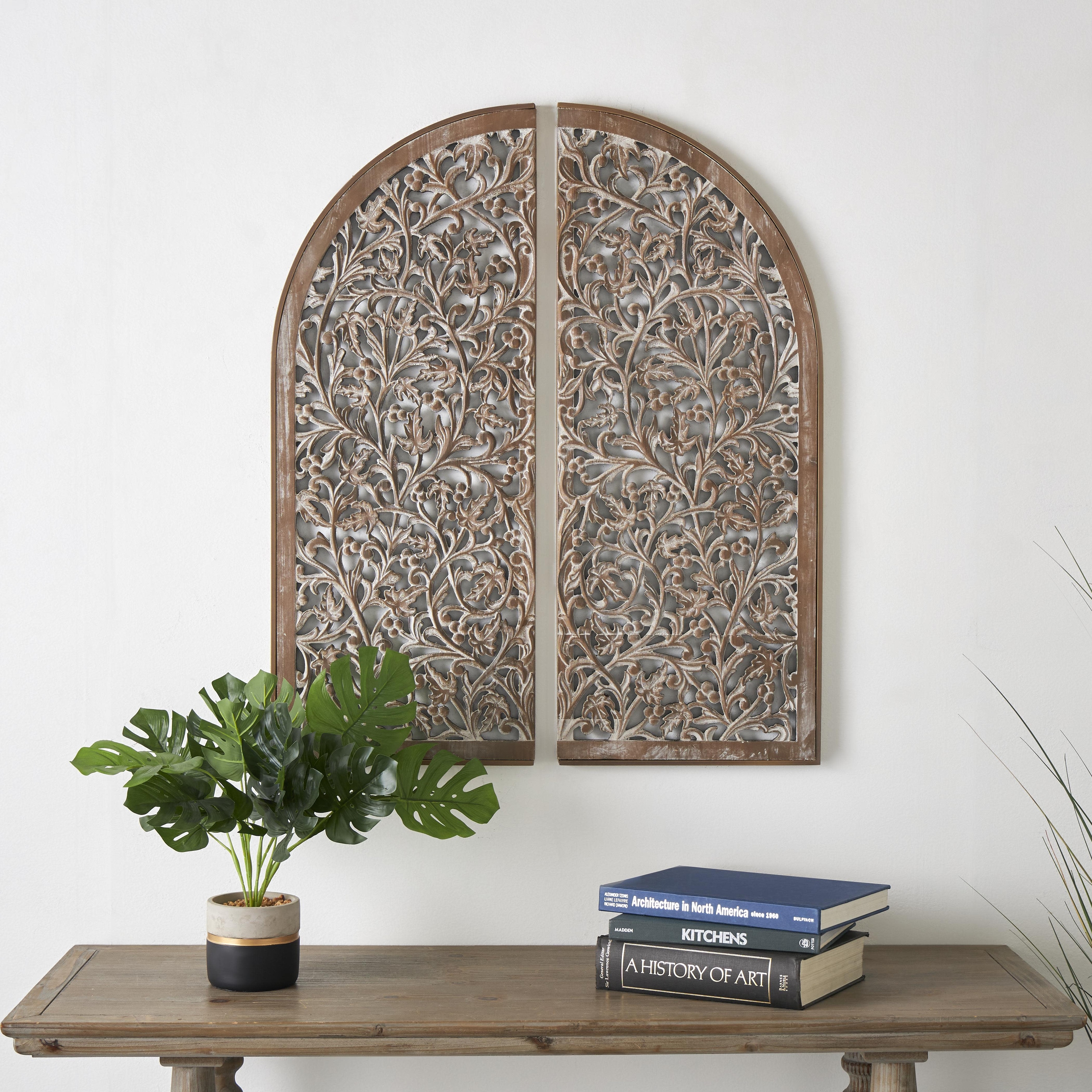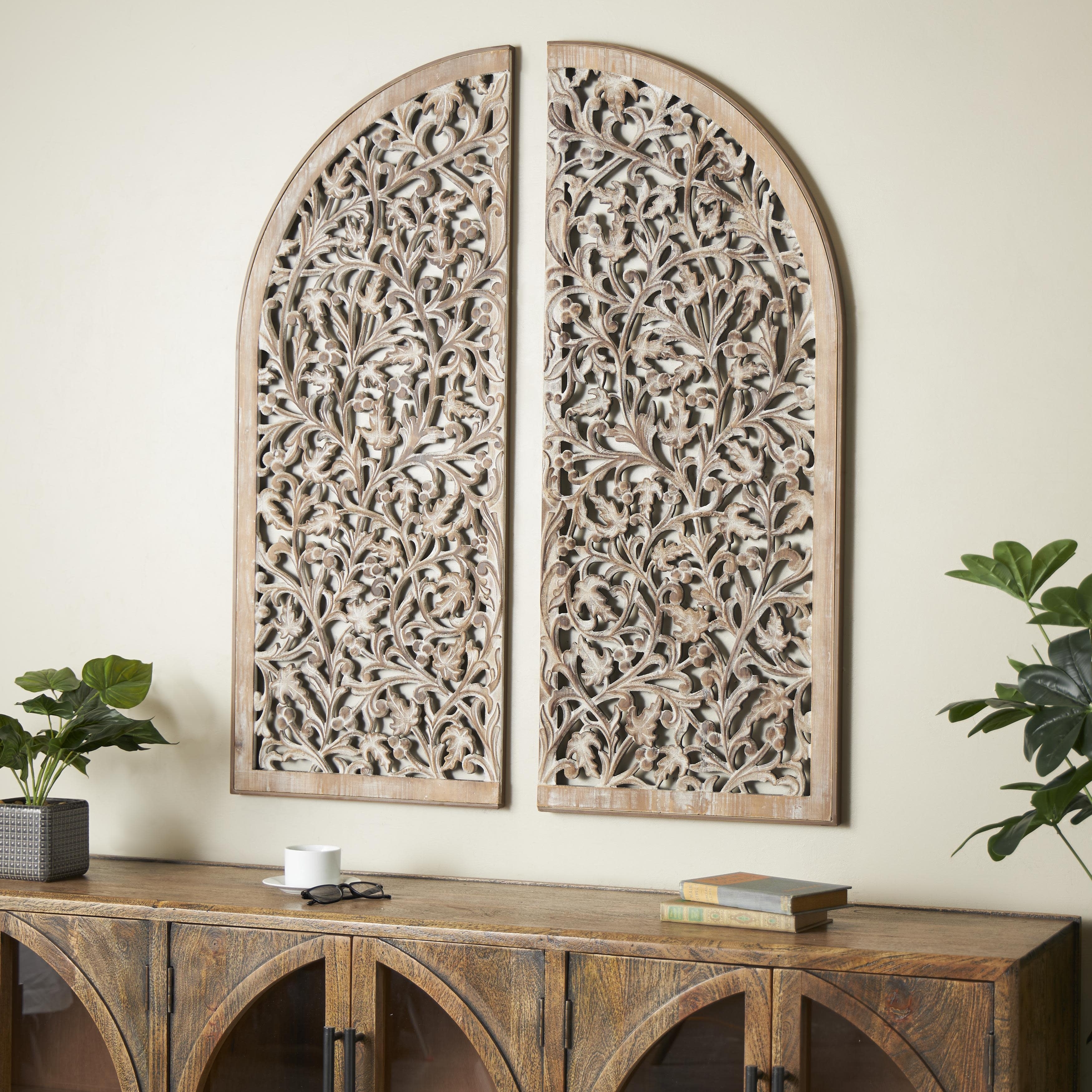 Brown Wooden Handmade Arched Floral Home Wall Decor with Intricate Carvings (Set of 2)