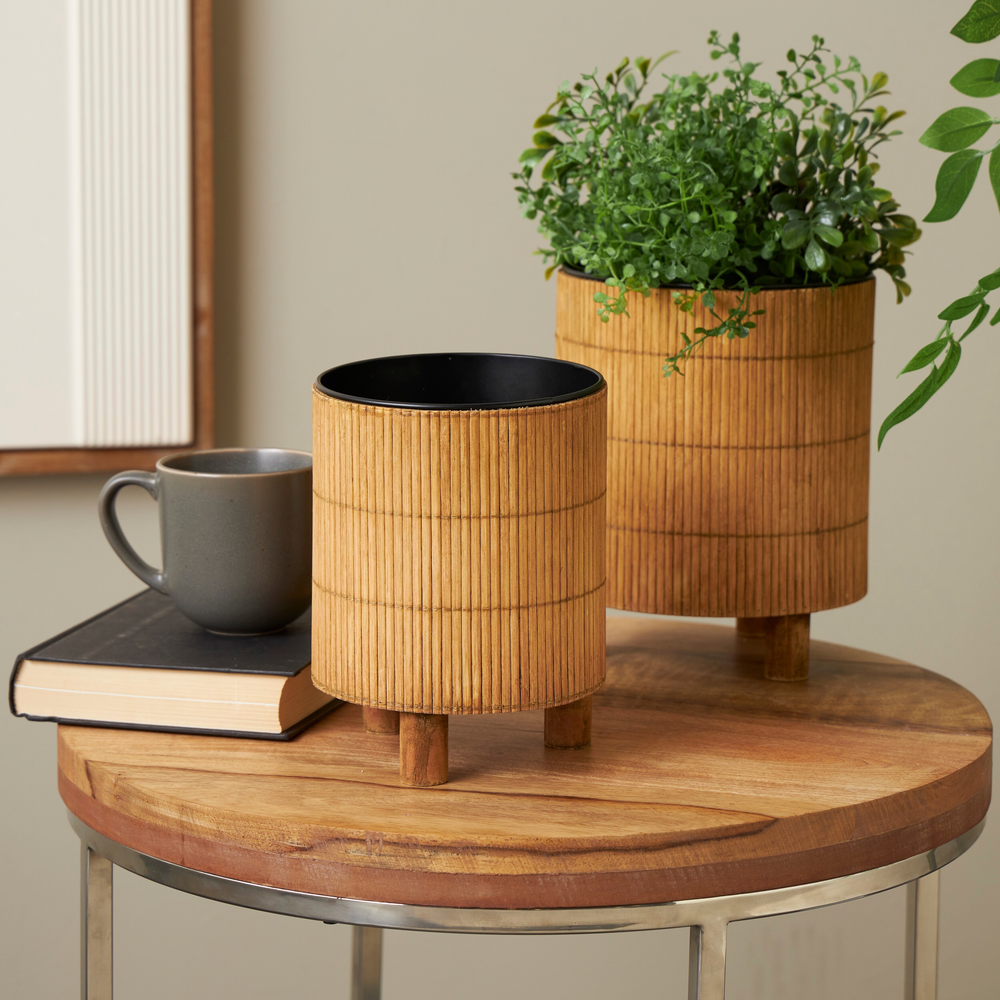 Brown Bamboo Handmade Planter with Black Metal Interior (Set of 2)