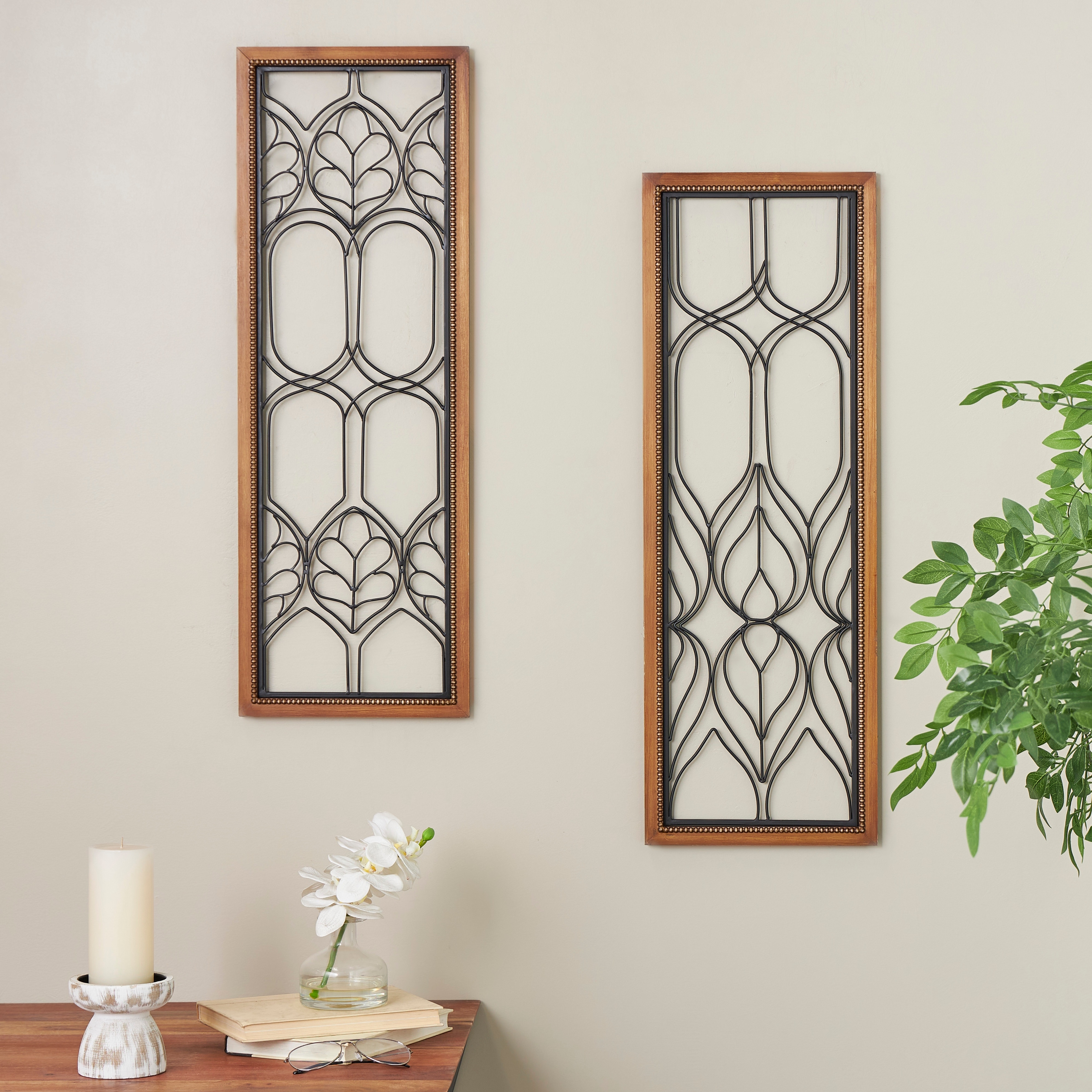 Black Metal Wire Cutout Geometric Home Wall Decor with Beaded Accents and Brown Wood Frames (Set of 2)