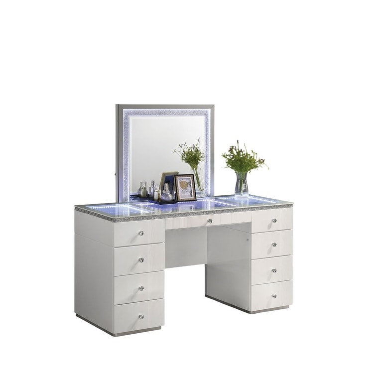 1pc Vanity w/ Stool Set Glass Top Storage Drawers Central Mirror w/ Bulbs USB And Power Outlet White and Gray Finish