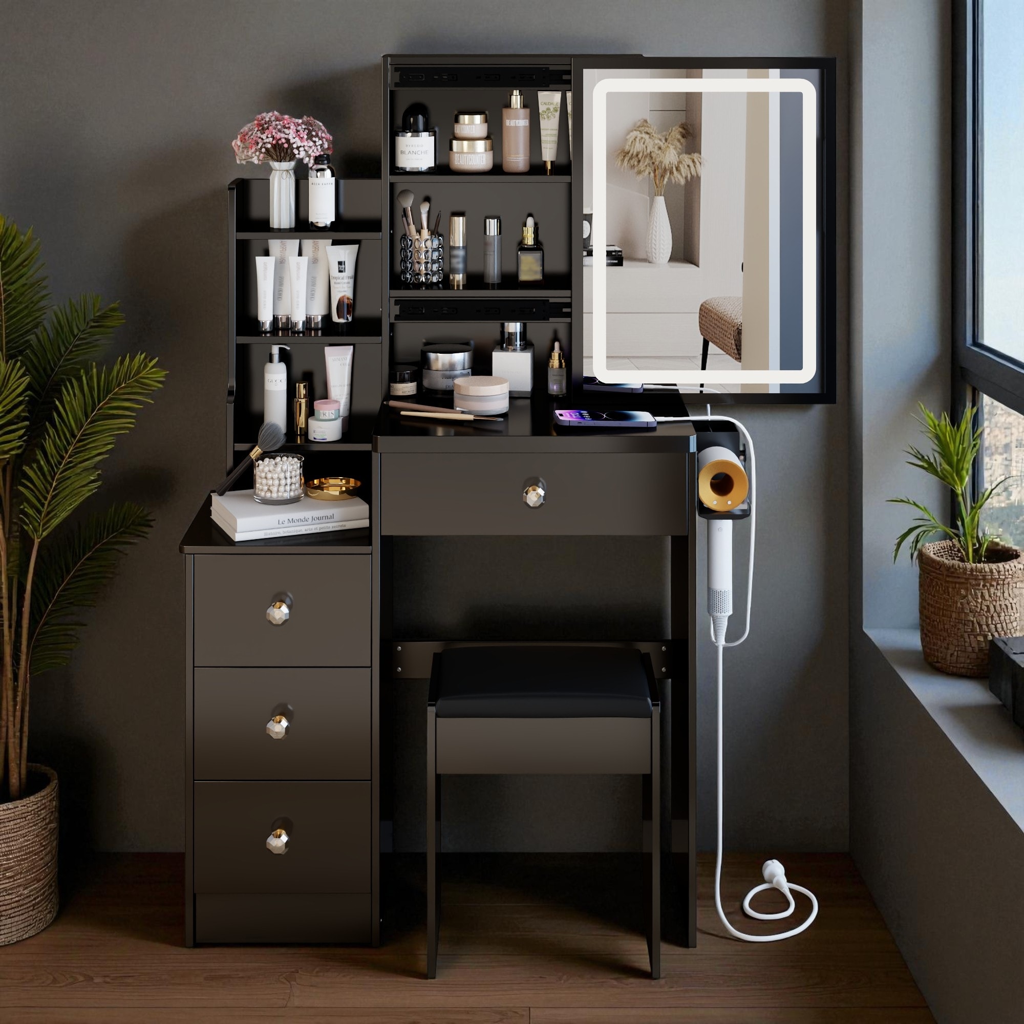 29.2" Small Vanity Table with LED Sliding Mirror, 2 AC + 2 USB Power Station, Hair Dryer Holder & Stool for Compact Spaces
