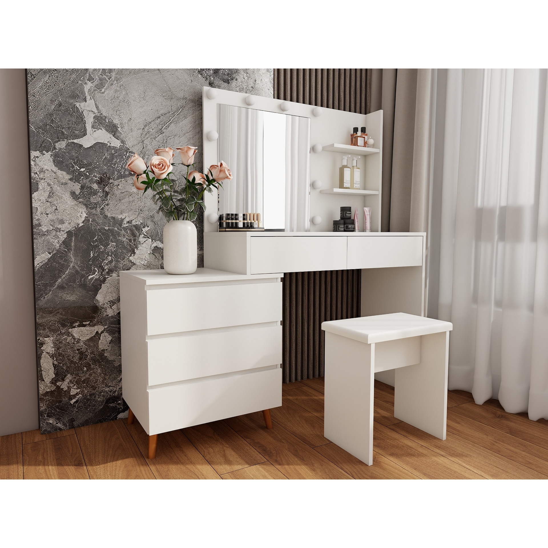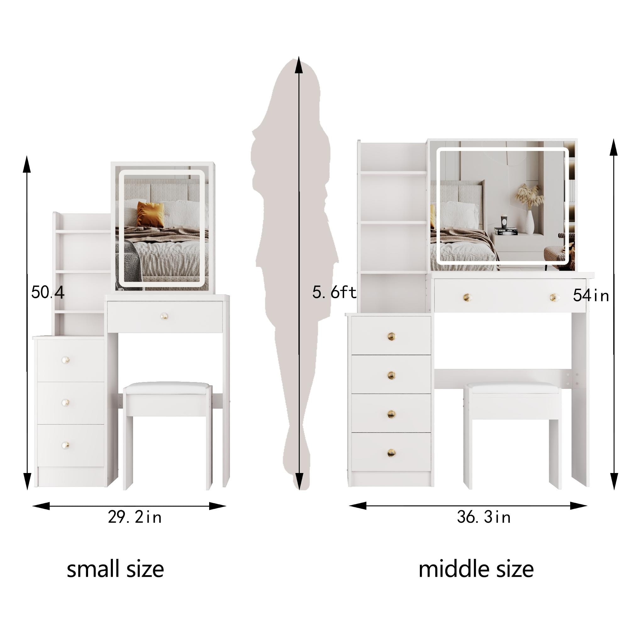29.2" Small Space Left Bedside Cabinet Vanity Table + Cushioned Stool, Extra Large Right sliding mirror
