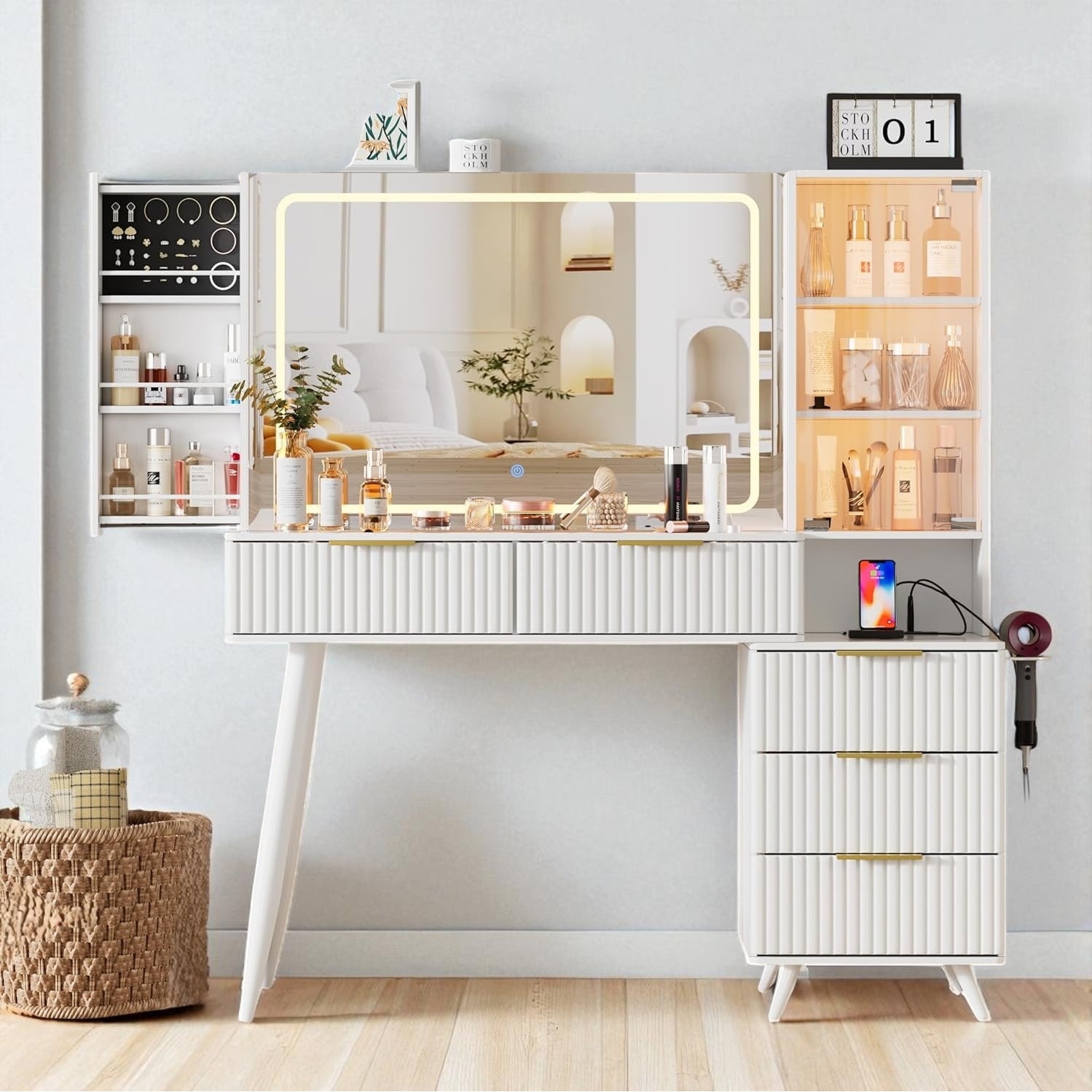 Large White Vanity Table with Mirror and 12 LED Lights, Makeup Desk with Deep Storage Drawers for Bedroom & Dressing Room
