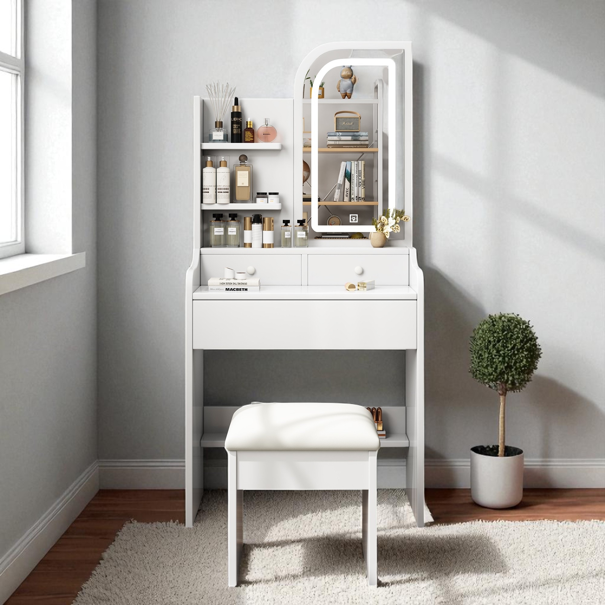 3 in 1 Vanity Desk With Mirror and Light, with Charging Station, With 2 Drawers and Open Storage Space, with Upholstered Stool