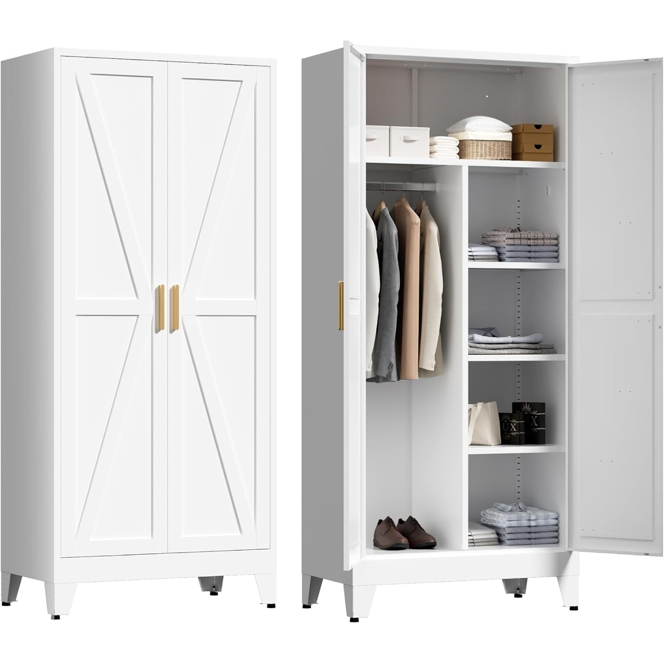 71-Inch Tall Metal Wardrobe Closet with Adjustable Shelves and Hanging Rod, 2-Door Storage Cabinet
