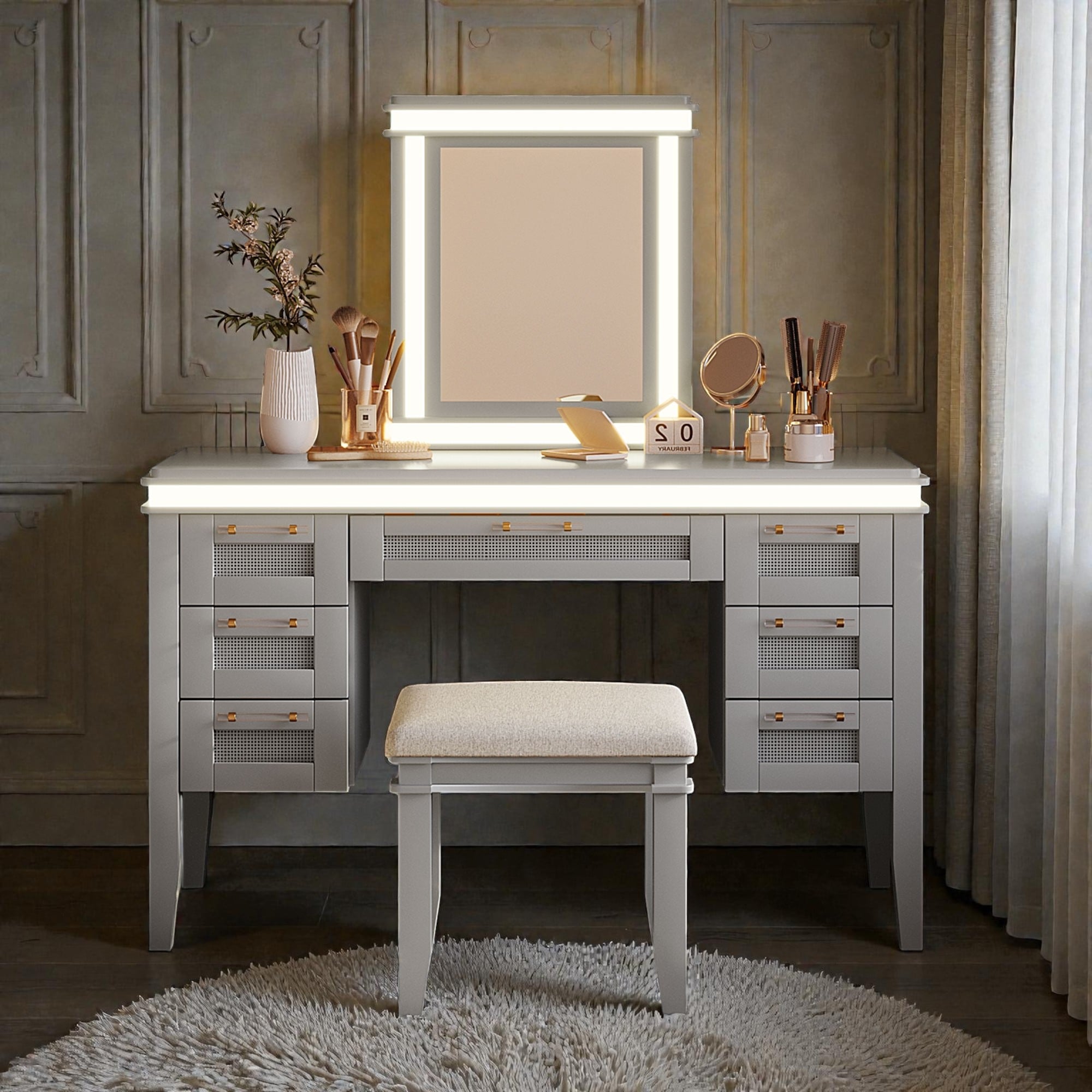 48" Makeup Vanity Desk with Mirror and Lights, 7-Drawer Dressing Table with Cushioned Stool, Classic Finish