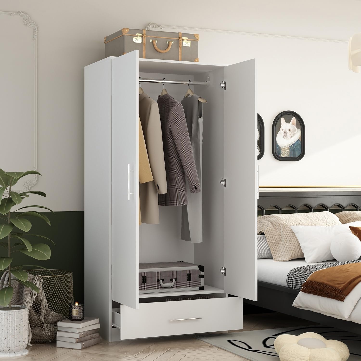 2-Door Wardrobe Armoire with Drawer, Freestanding Wood Clothes Storage Cabinet, White