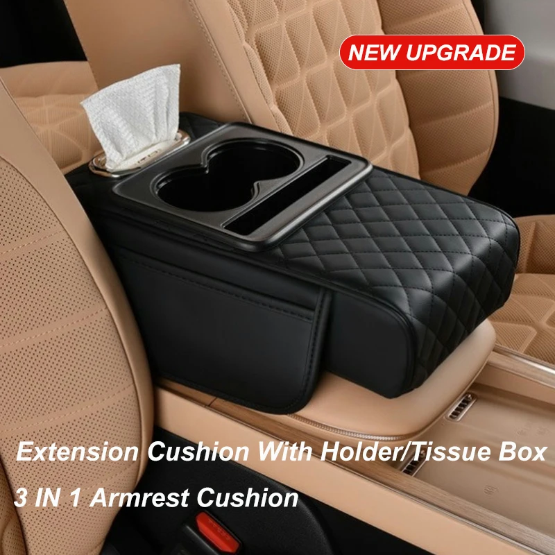 Thickened Car Center Console Armrest Cushion, With Side Extension, Cup Holder, And Tissue Box Organizer black