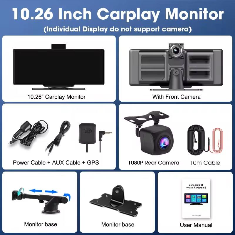 10.26 Inch 4K Smart Dash Cam Mirror With CarPlay Android Auto And GPS no Sd Card 10m Dvr Rear Cam + Gps