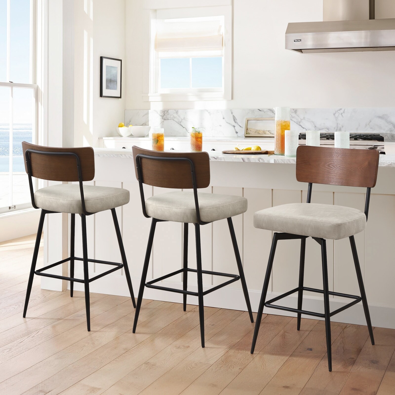 Set of 3, 26-Inch Counter Height Bar Stools - Cane Rattan Back, Linen Upholstered Seat, Swivel Design for Kitchen